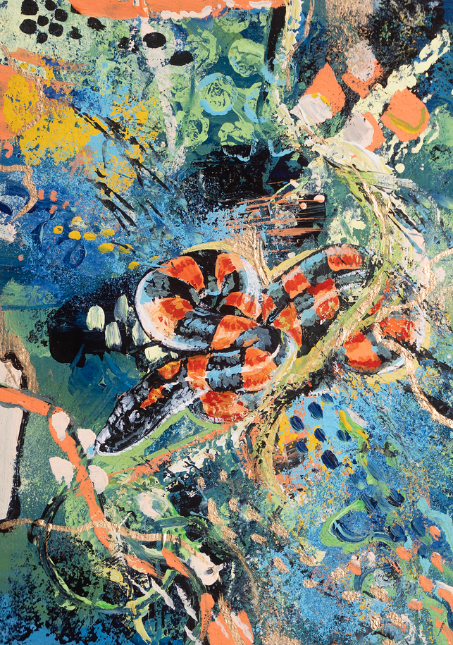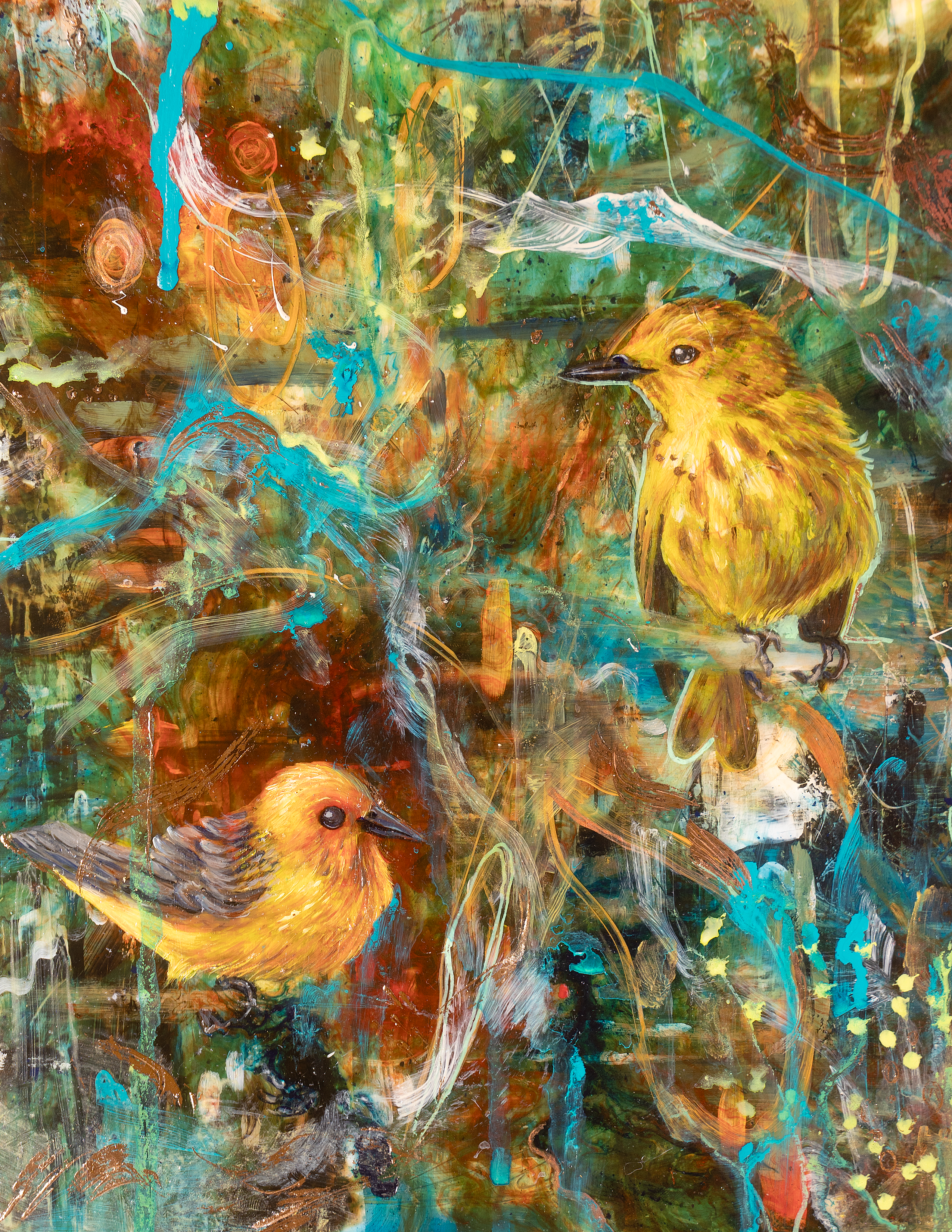 My work with abstract led me to my most recent body of work - Abstract Homes. In this collection I strive to create a unique abstract environment, that an animal can rest and be safe in. The habitat is their unique home, and they feel incorporated into that space. Vibrant colors, expressive brushstrokes, and layered depth are the signatures of these pieces.